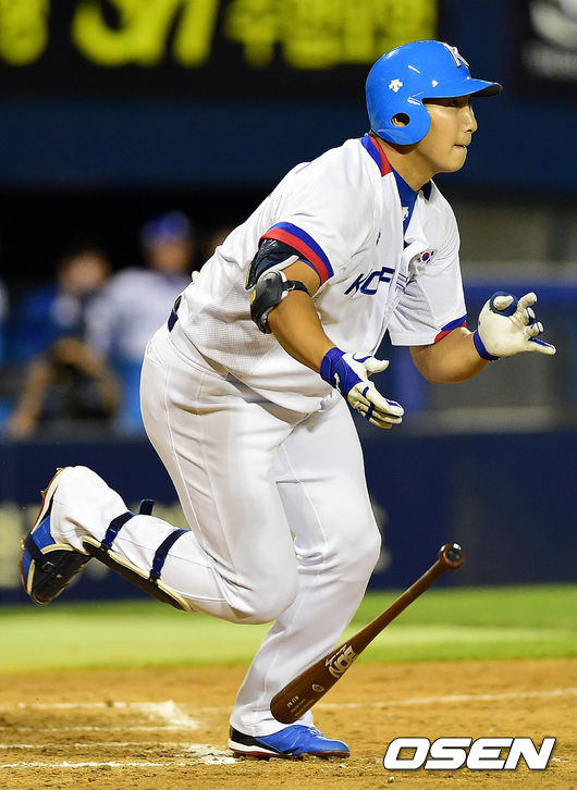 8회말 대표팀 공격 선두타자로 나선 나성범이 우익선상 2루타를 날리고 있다.