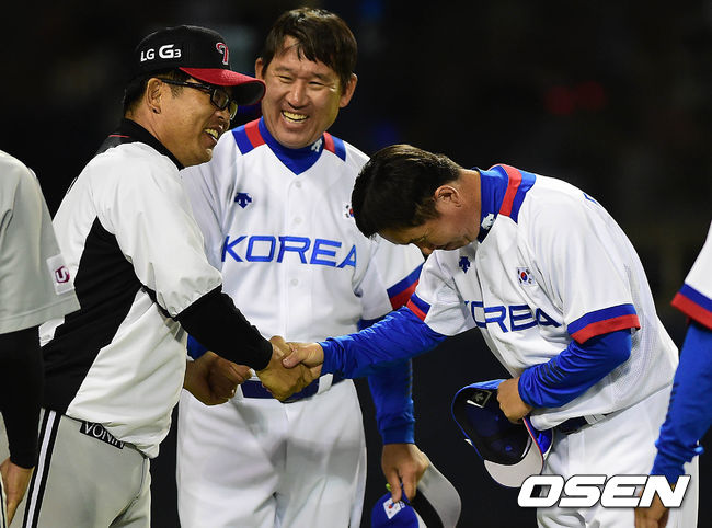 경기 종료 후 대표팀 유지현 코치과 LG 양상문 감독이 악수를 나누고 있다./dreamer@osen.co.kr