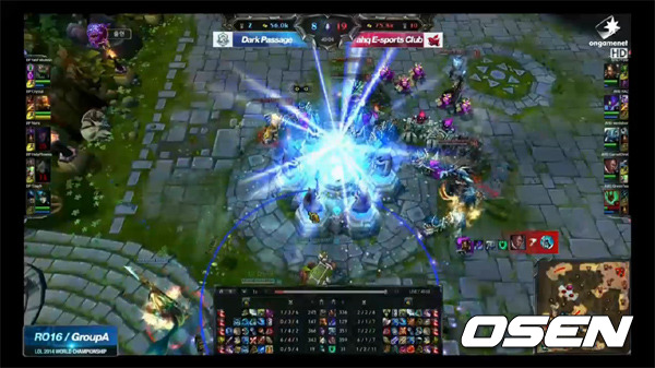 AHQ e스포츠클럽은 18일 오후 국립 대만 대학교 종합체육관 특설무대에서 벌어진 'LOL 월드챔피언십(이하 롤드컵)' 시즌4 그룹스테이지 A조 다크패시지와 경기서 리우슈웨이의 대활약에 힘입어 손쉽게 승리를 거뒀다. 와일드카드로 나선 다크패시지는 초반 기울었던 경기를 포기하지 않고 끝까지 선전했지만 그 차이를 극복하지 못하고 무릎을 꿇었다.