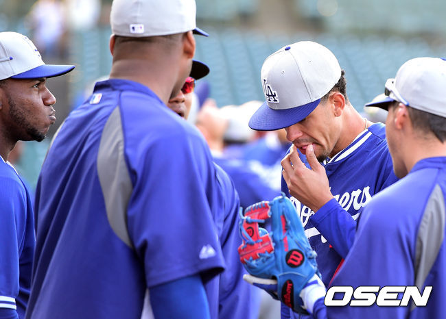19일(이하 한국시간) 미국 일리노이주 시카고 리글리 필드에서 열린 '2014 메이저리그' LA 다저스와 시카고 컵스의 경기, 경기에 앞서 다저스 프리아스가 동료선수들과 이야기를 나누며 몸을 풀고 있다.