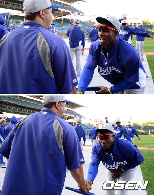 19일(이하 한국시간) 미국 일리노이주 시카고 리글리 필드에서 열린 '2014 메이저리그' LA 다저스와 시카고 컵스의 경기, 경기에 앞서 다저스 푸이그가 코칭스태프와 장난을 치고 있다.