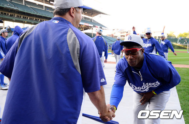 19일(이하 한국시간) 미국 일리노이주 시카고 리글리 필드에서 열린 '2014 메이저리그' LA 다저스와 시카고 컵스의 경기, 경기에 앞서 다저스 푸이그가 코칭스태프와 장난을 치고 있다.