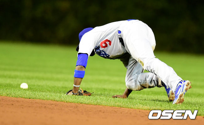 19일(이하 한국시간) 미국 일리노이주 시카고 리글리 필드에서 열린 '2014 메이저리그' LA 다저스와 시카고 컵스의 경기, 2회말 2사에서 다저스 고든이 컵스 코글란의 타구를 잡고 놓치며 아쉬워하고 있다.