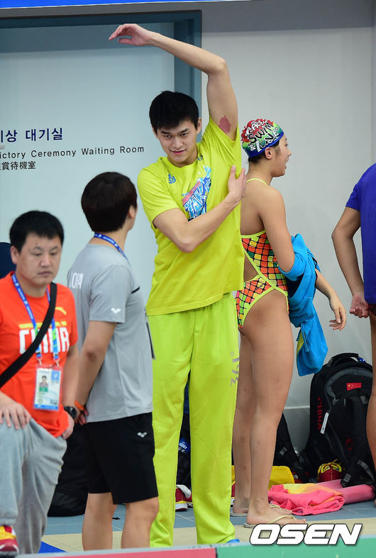 쑨양이 19일 오전 인천 문학박태환수영장에서 훈련 전 몸을 풀고 있다.