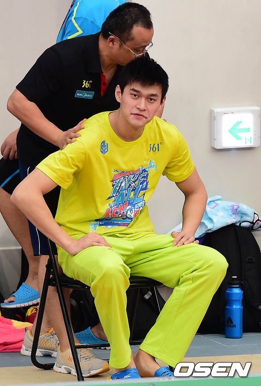 쑨양이 19일 오전 인천 문학박태환수영장에서 훈련 전 몸을 풀고 있다.