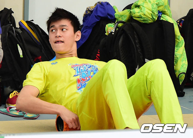 쑨양이 19일 오전 인천 문학박태환수영장에서 훈련 전 몸을 풀고 있다.