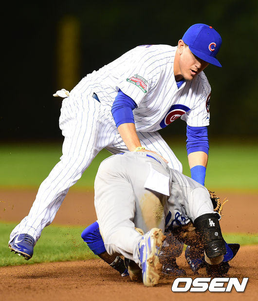 19일(이하 한국시간) 미국 일리노이주 시카고 리글리 필드에서 열린 '2014 메이저리그' LA 다저스와 시카고 컵스의 경기, 4회초 무사 다저스 푸이그 타석에 1루 주자 고든이 견제에 협살을 당하며 태그아웃당하고 있다.