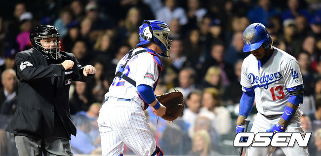 19일(이하 한국시간) 미국 일리노이주 시카고 리글리 필드에서 열린 '2014 메이저리그' LA 다저스와 시카고 컵스의 경기, 4회초 2사 1,3루에서 다저스 라미레즈가 삼진으로 물러나며 아쉬워하고 있다.