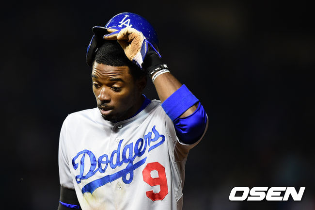 19일(이하 한국시간) 미국 일리노이주 시카고 리글리 필드에서 열린 '2014 메이저리그' LA 다저스와 시카고 컵스의 경기, 4회초 무사 다저스 푸이그 타석에 1루 주자 고든이 견제에 협살을 당하고 아웃되며 아쉬워하고 있다.