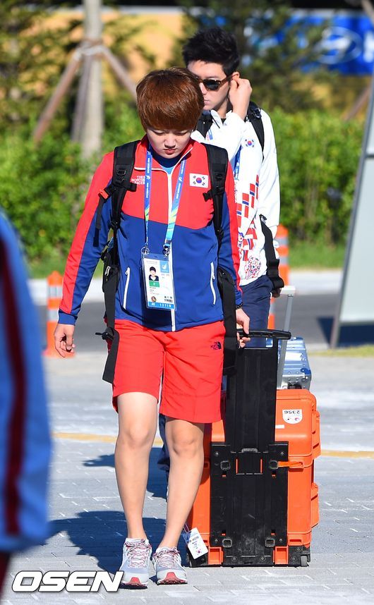 개회식이 열리는 19일 오전 인천 연수구 옥련국제사격장에서 사격대표팀 진종오와 김장미가 함께 경기장으로 들어서고 있다