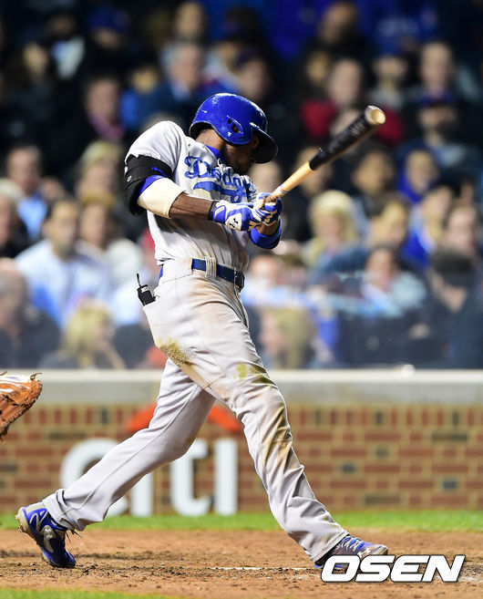 19일(이하 한국시간) 미국 일리노이주 시카고 리글리 필드에서 열린 '2014 메이저리그' LA 다저스와 시카고 컵스의 경기, 7회초 2사 3루에서 다저스 고든이 역전 1타점 적시2루타를 날리고 있다.
