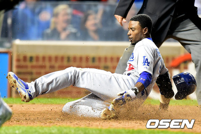 19일(이하 한국시간) 미국 일리노이주 시카고 리글리 필드에서 열린 '2014 메이저리그' LA 다저스와 시카고 컵스의 경기, 7회초 2사 2루에서 다저스 고든이 푸이그의 1타점 적시타에 홈에서 세이프되고 있다.