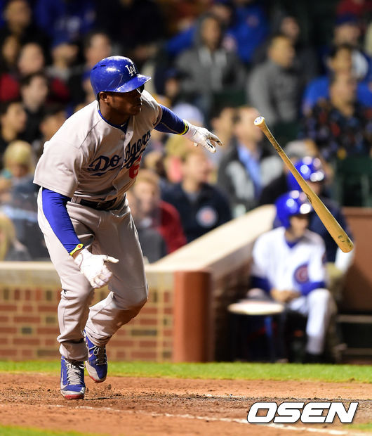 19일(이하 한국시간) 미국 일리노이주 시카고 리글리 필드에서 열린 '2014 메이저리그' LA 다저스와 시카고 컵스의 경기, 7회초 2사 2루에서 다저스 푸이그가 1타점 적시타를 날리며 타구를 바라보고 있다.