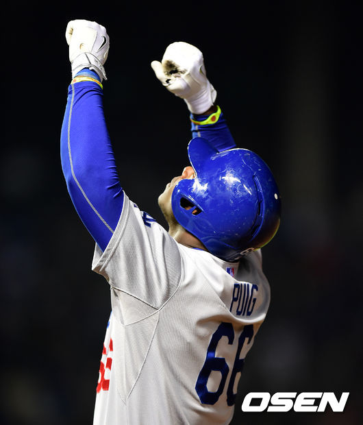 19일(이하 한국시간) 미국 일리노이주 시카고 리글리 필드에서 열린 '2014 메이저리그' LA 다저스와 시카고 컵스의 경기, 7회초 2사 2루에서 다저스 푸이그가 1타점 적시타를 날리고 기뻐하고 있다.