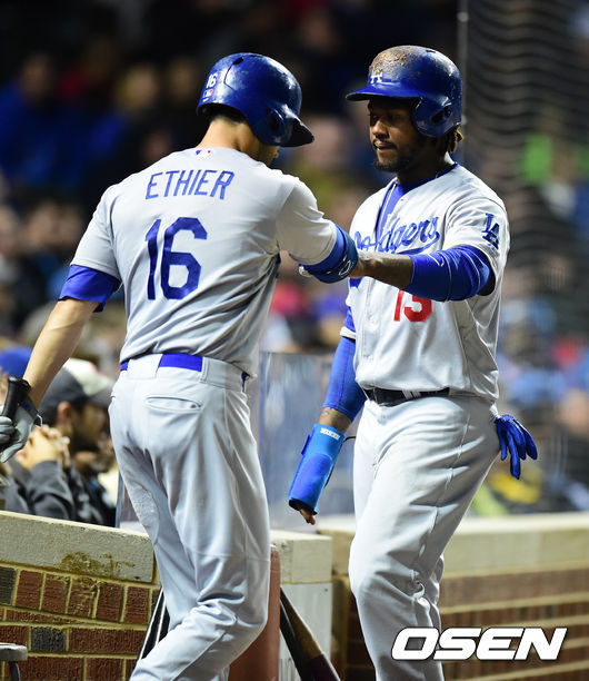 19일(이하 한국시간) 미국 일리노이주 시카고 리글리 필드에서 열린 '2014 메이저리그' LA 다저스와 시카고 컵스의 경기, 7회초 1사 1,3루에서 다저스 유리베의 2루땅볼에 라미레즈가 홈을 밟고 이디어와 하이파이브를 하고 있다.