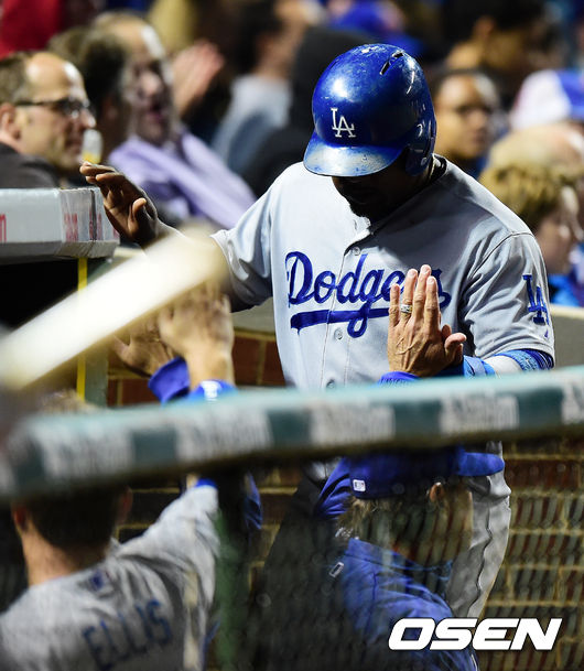 19일(이하 한국시간) 미국 일리노이주 시카고 리글리 필드에서 열린 '2014 메이저리그' LA 다저스와 시카고 컵스의 경기, 7회초 1사 2,3루에서 다저스 유리베가 터너의 3루 땅볼에 홈을 밟아 더그아웃에서 매팅리 감독과 하이파이브를 하고 있다.