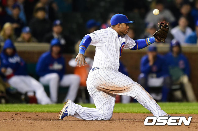 19일(이하 한국시간) 미국 일리노이주 시카고 리글리 필드에서 열린 '2014 메이저리그' LA 다저스와 시카고 컵스의 경기, 8회초 1사에서 컵스 발부에나가 다저스 라미레즈의 3루땅볼 타구를 놓치고 있다.