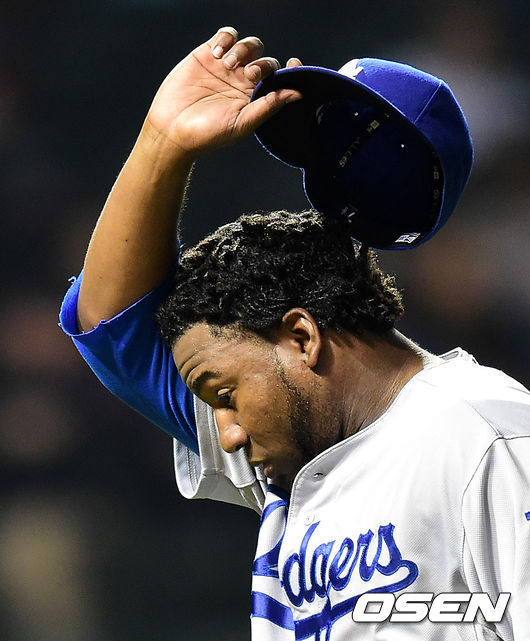 19일(이하 한국시간) 미국 일리노이주 시카고 리글리 필드에서 열린 '2014 메이저리그' LA 다저스와 시카고 컵스의 경기, 7회말 다저스 바에즈가 위기를 넘기고 더그아웃으로 향하며 땀을 닦고 있다.