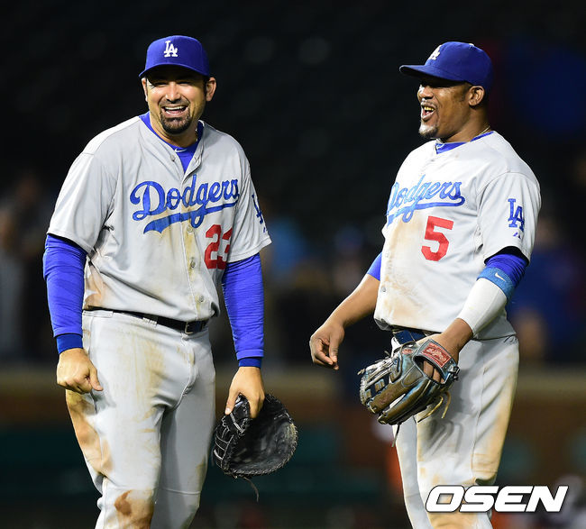 경기후 다저스 곤잘레스, 유리베가 승리를 기뻐하고 있다./jpnews@osen.co.kr