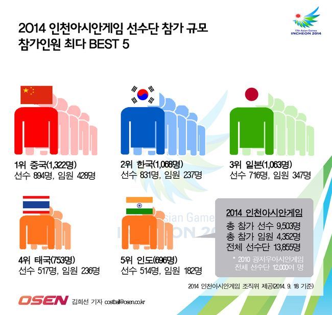 인천아시안게임 조직위원회는 19일 2014 인천아시안게임 참가국 선수단 규모를 공개했다. 선수단 규모 부동의 1위는 중국으로, 선수 894명과 임원 428명 총 1322명의 선수단을 파견했다. 개최국 한국은 중국에 이어 2위를 차지했다. 한국은 38개 종목 831명의 선수들이 출전하며, 임원 237명을 더해 1068명이 참가했다.