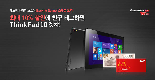 한국레노버는 9월 18일부터 10월 7일까지 온라인 스토어 개편을 기념해 다양한 이벤트를 실시한다. 페이스북에 레노버 온라인 스토어 개편 행사 관련 포스팅을 태그한 회원들 중 65명을 추첨해 레노버 인기 태블릿인 씽크패드 10과 10만 원 상당의 백화점 상품권 또는 만원 상당의 푸짐한 사은품을 증정할 예정이다.