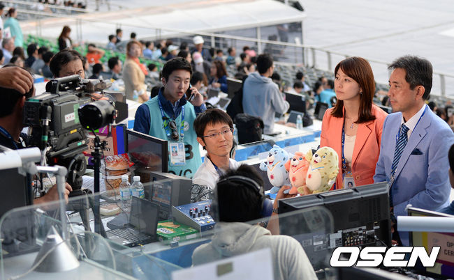 19일 오후 인천 서구 연희동 인천아시아드주경기장에서 열리는 제17회 인천 아시안게임 개막식을 앞두고, 일본 NHK 중계진이 방송을 준비하고 있다.