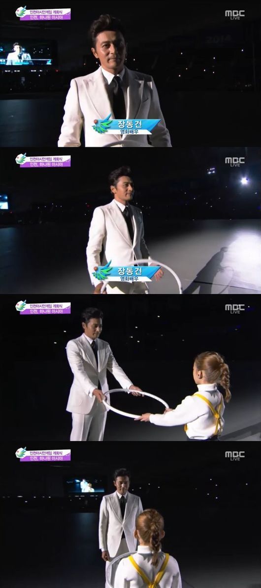 장동건은 19일 오후 6시 방송 3사(KBS,MBC,SBS)를 통해 중계된 2014 인천아시안게임 개회식에서 굴렁쇠 소녀와 퍼포먼스를 선보였다.