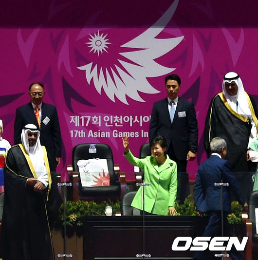 19일 오후 인천 서구 연희동 인천아시아드주경기장에서 열리는 제17회 인천 아시안게임 개막식, 박근혜 대통령이 관중들에게 인사를 하고 있다.