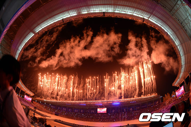 19일 오후 인천 서구 연희동 인천아시아드주경기장에서 열리는 제17회 인천 아시안게임 개막식, 개막을 알리는 축포가 밤하늘을 장식하고 있다.