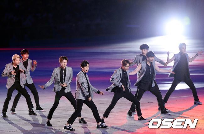 19일 오후 인천 서구 연희동 인천아시아드주경기장에서 열리는 제17회 인천 아시안게임 개막식, 엑소가 멋진 무대를 장식하고 있다.