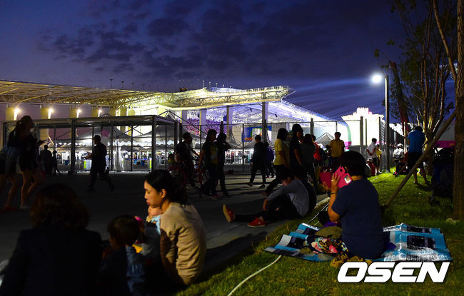 19일 오후 인천 서구 연희동 인천아시아드주경기장에서 제17회 인천 아시안게임 개막식이 열린 가운데, 시민들이 경기장 밖에 앉아 불꽃놀이를 기다리고 있다.