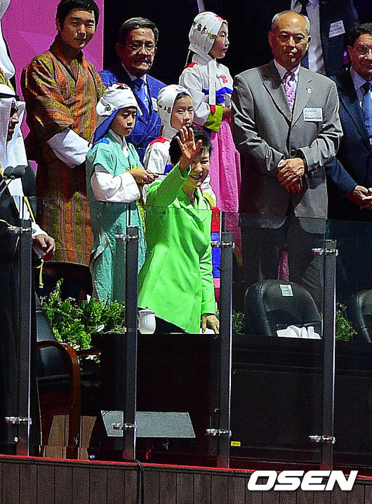 19일 오후 인천 서구 연희동 인천아시아드주경기장에서 열린 제17회 인천 아시안게임 개막식, 박근혜 대통령이 개막식에 참석해 손을 흔들고 있다.