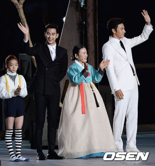 19일 오후 인천 서구 연희동 인천아시아드주경기장에서 열린 제17회 인천 아시안게임 개막식, 배우 김수현과 장동건, 안숙선 명창, 굴렁쇠 소녀가 함께 입장해 손을 흔들고 있다.