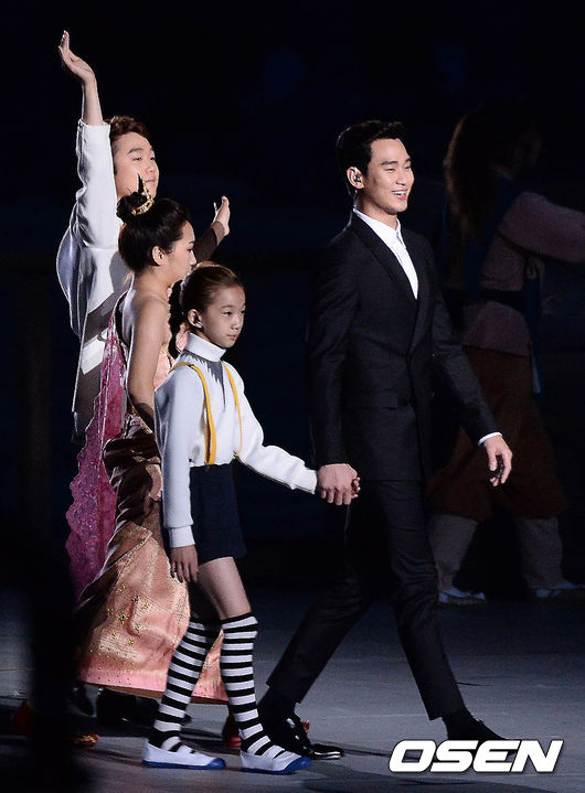 19일 오후 인천 서구 연희동 인천아시아드주경기장에서 열린 제17회 인천 아시안게임 개막식, 배우 김수현이 굴렁쇠소녀 김민과 함께 손을 잡고 입장하고 있다.
