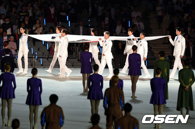 19일 오후 인천 서구 연희동 인천아시아드주경기장에서 열린 제17회 인천 아시안게임 개막식, 산악인 엄홍길, 석해균 선장, 전 마라토너 이봉주, 배우 현빈, 발레리나 강수진, 전 육상선수 임춘애, 국회의원 이자스민, 골퍼 박세리 등이 태극기를 들고 입장하고 있다.