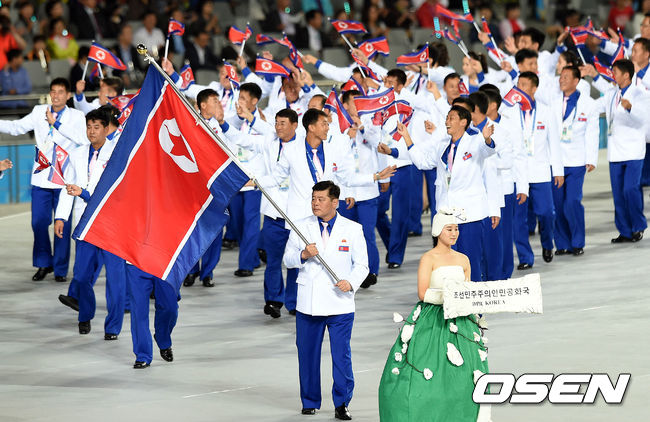 인천 아시안게임 개막식 입장하는 북한,'반갑습니다'