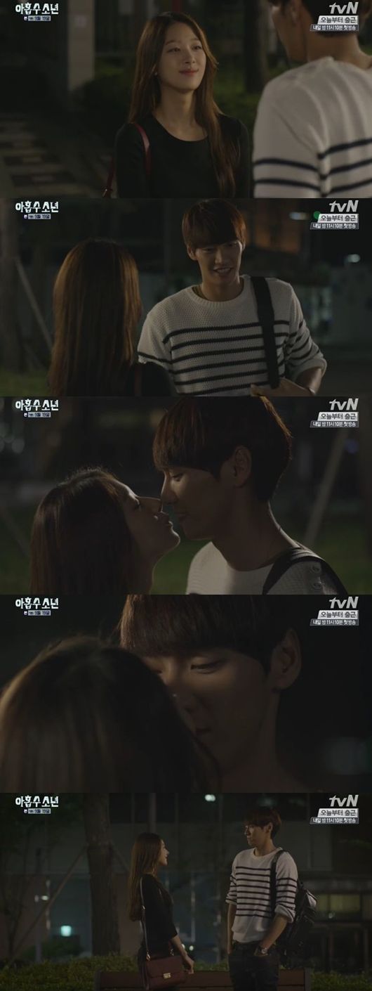 19일 오후 방송한 '아홉수 소년'(극본 박유미, 연출 유학찬) 7화 '9월 19일'편에서는 아홉수를 맞아 짝사랑으로 가슴 아파하는 강진구(김영광 분)가 마세영(경수진 분)이 아닌 고은(민하 분)과 입을 맞추는 모습이 그려졌다.