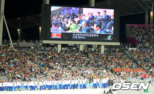 19일 오후 인천 서구 연희동 인천아시아드주경기장에서 열린 제17회 인천 아시안게임 개막식, 북한 선수단이 입장하고 있는 가운데 박근혜 대통령이 박수를 치고 있다.