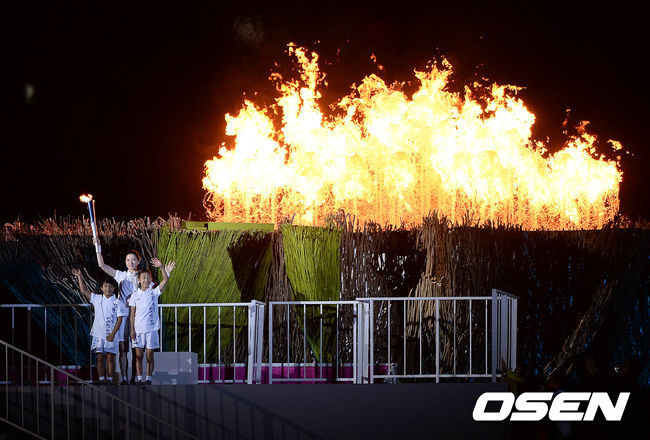 19일 오후 인천 서구 연희동 인천아시아드주경기장에서 열린 제17회 인천 아시안게임 개막식, 배우 이영애가 최종 점화자로 나서 점화를 마친 뒤 손을 흔들고 있다.