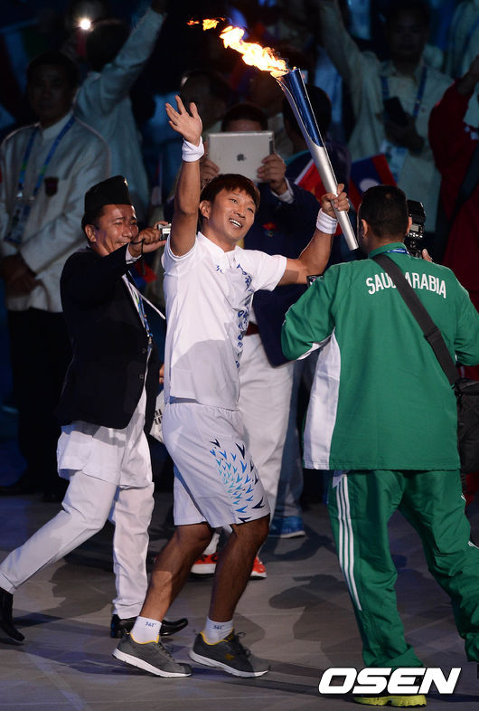 19일 오후 인천 서구 연희동 인천아시아드주경기장에서 열린 제17회 인천 아시안게임 개막식, 전 스피드스케이팅 선수 이규혁이 성화봉송을 하며 손을 흔들고 있다.
