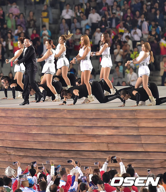 19일 오후 인천 서구 연희동 인천아시아드주경기장에서 열린 제17회 인천 아시안게임 개막식, 가수 싸이가 선수단과 함께 흥겨운 무대를 펼치고 있다.