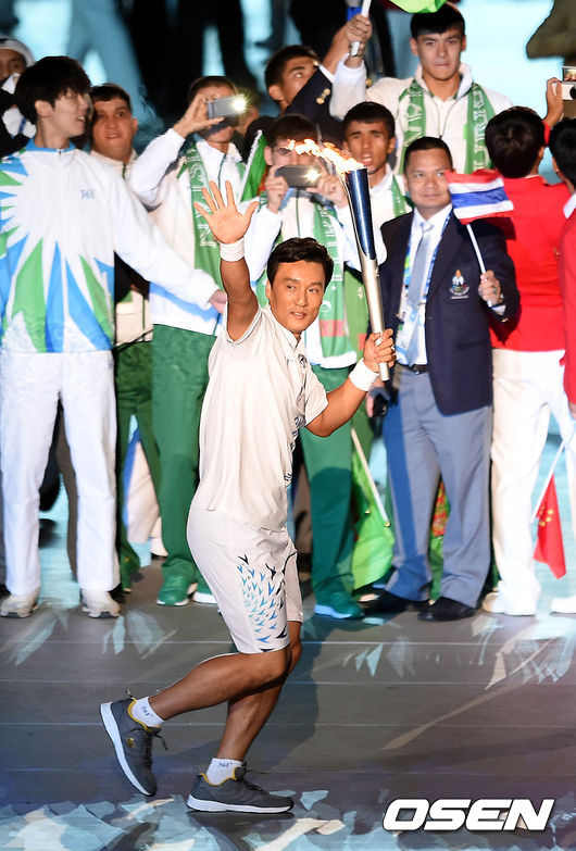 19일 오후 인천 서구 연희동 인천아시아드주경기장에서 열린 제17회 인천 아시안게임 개막식, 야구선수 이승엽이 성화봉송을 하고 있다.