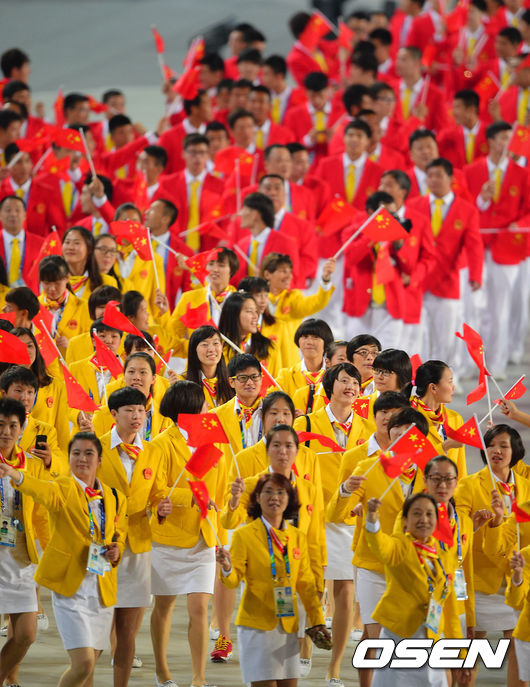 [아시안게임 개막식]밝은모습으로 입장하는 중국 선수단