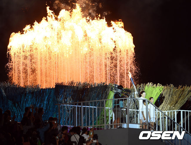 19일 오후 인천 서구 연희동 인천아시아드주경기장에서 열린 제17회 인천 아시안게임 개막식, 이영애가 성화 최종주자로 불을 붙이고 있다.