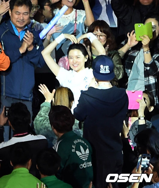 19일 오후 인천 서구 연희동 인천아시아드주경기장에서 열린 제17회 인천 아시안게임 개막식, 최종점화자로 나선 배우 이영애가 하트를 그리고 있다.