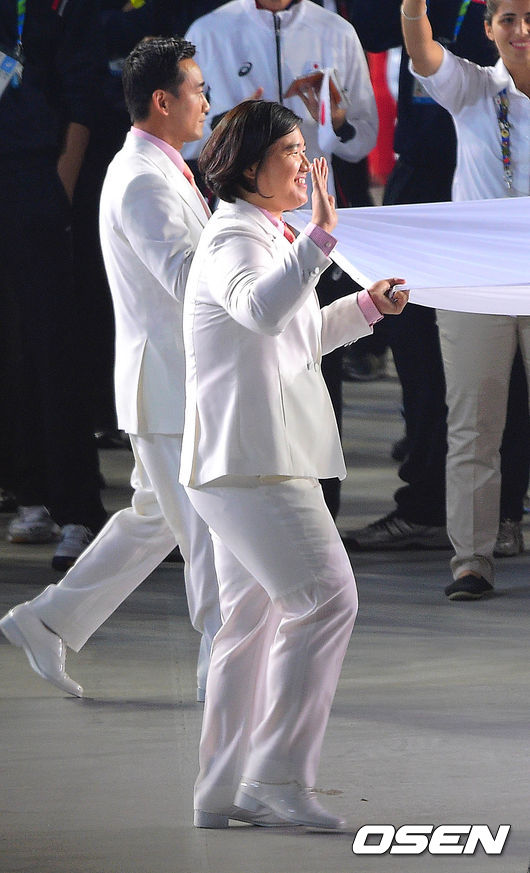 19일 오후 인천 서구 연희동 인천아시아드주경기장에서 열린 제17회 인천 아시안게임 개막식, 전 역도선수 장미란과 전 체조선수 여홍철이 대회기를 들고 입장하고 있다.
