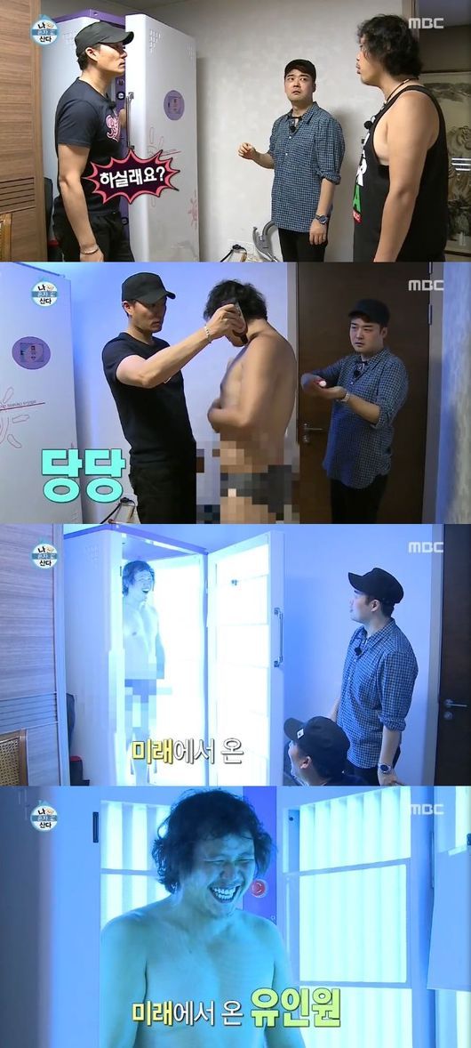 장미여관 육중완이 배우 이태곤의 집에 있는 태닝기 안에 옷을 벗고 들어가며 웃음을 줬다.