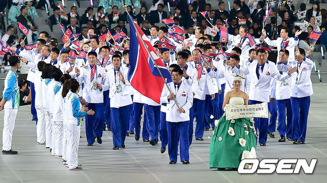 19일 오후 인천 서구 연희동 인천아시아드주경기장에서 열린 제17회 인천 아시안게임 개막식, 북한 선수단이 입장하고 있다.