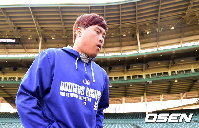 20일(이하 한국시간) 미국 일리노이주 시카고 리글리 필드에서 열린 '2014 메이저리그' LA 다저스와 시카고 컵스의 경기, 경기에 앞서 다저스 류현진이 인터뷰를 하기 위해 그라운드에 모습을 보이고 있다.