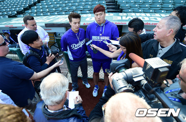 20일(이하 한국시간) 미국 일리노이주 시카고 리글리 필드에서 열린 '2014 메이저리그' LA 다저스와 시카고 컵스의 경기, 경기에 앞서 다저스 류현진이 인터뷰를 하고 있다. 류현진은 복귀 시점에 대해선 공을 던져봐야 알 수 있을 거 같다고 밝혔다.